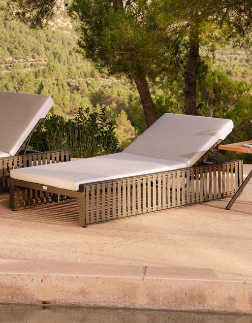 The Horizon Chaise Lounger with Sunbrella Cushion is a sleek and contemporary addition to any luxury outdoor setting. Constructed with a powder-coa...