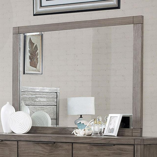 FOA EastA warm, wire-brushed finish and plank-style aesthetics give this mirror and the Amarillo set a cohesive look.
