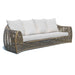 The Ruby Sofa blends modern aesthetics with durable outdoor design. Built with a sturdy aluminum frame in a silver walnut finish, it features handwoven Ecolene Kubu Mushroom synthetic fibers for a unique open-weave look. The Sunbrella cushions provide luxurious comfort while resisting weather and fading, making this sofa perfect for any outdoor space.