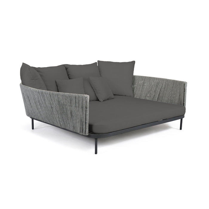 A captivating piece that effortlessly transforms any outdoor space into a stylish haven. Its broad backrests lend an intimate and unparalleled charm. The daybed features a powder-coated aluminum frame and a light gray polystrand strap rope. A comfortable cushion is included in 5453 Sunbrella Canvas or you can choose from other available Sunbrella options. Crafted for durability, the chaise lounger combines modern elegance with resistance against the elements. Create a personalized outdoor oasis with the Boston Outdoor Daybed where style, comfort, and durability converge.