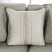 Imagine your space elevated with a centerpiece like this one. This living room group features sloped armrests for relaxed seating, while the removable box cushions with matching welt trim make maintenance an easy task, especially with its stain-resistant fabric. Beautiful lines and patterns on the matching chair, ottoman, and accent pillows bring splashes of gold to the neutral gray base color. Fully upholstered, this piece is great for any transitional home wanting a substantial update in looks and comfort.